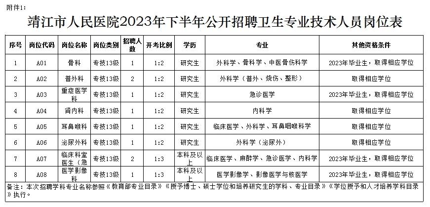 1.《靖江市人民医院2023年下半年公开招聘卫生专业技术人员岗位表》